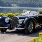 A vintage black 1937 Bugatti Type 57SC Atlantic car with a sleek design is parked on a winding road beside a tranquil lake. Lush greenery and mountains create a stunning backdrop under a cloudy sky.