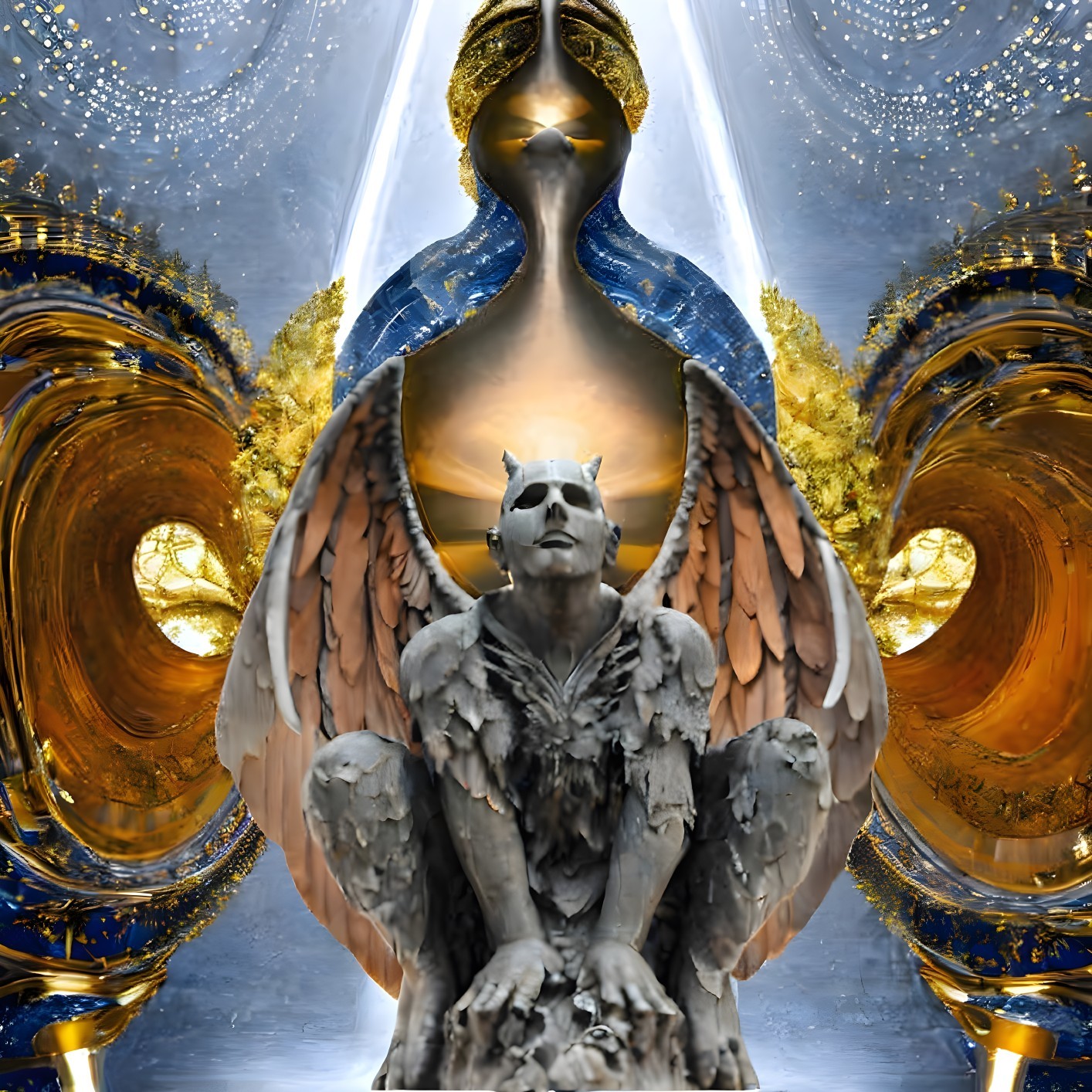 Digital art: Two angelic figures with golden headgear in ornate gold and blue backdrop