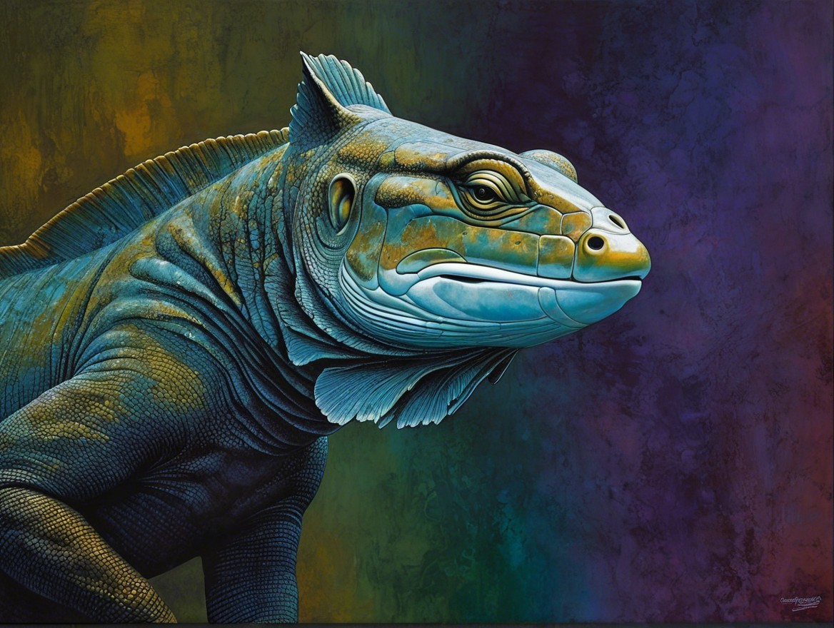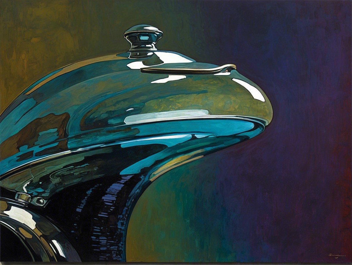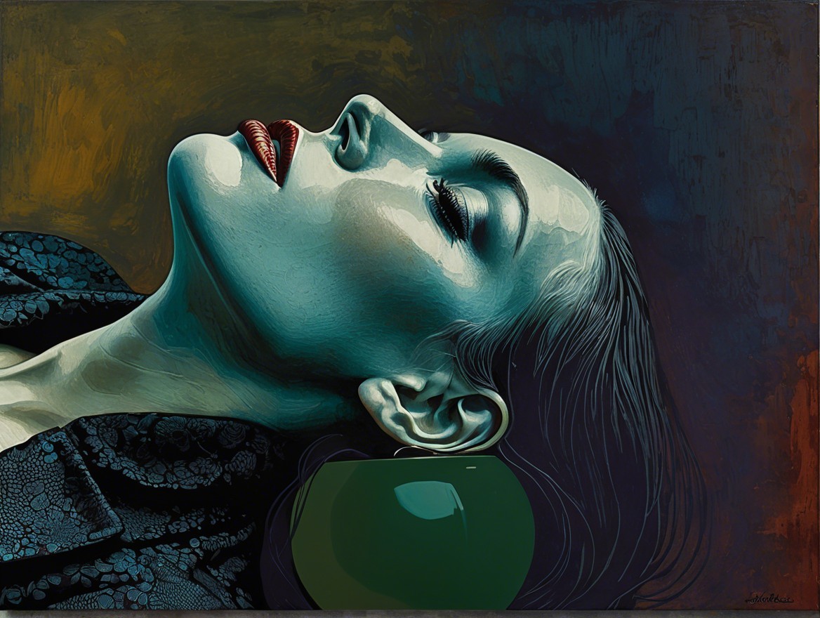 A striking portrait of a woman with a side profile. Her skin is a pale hue, accentuated by bold red lips. The artwork features a textured background, enhancing the subject's elegance and allure.