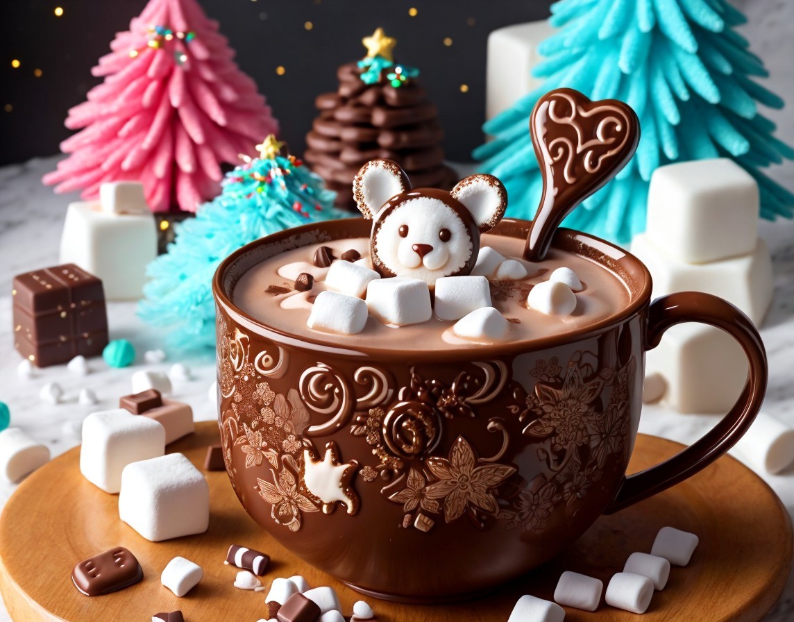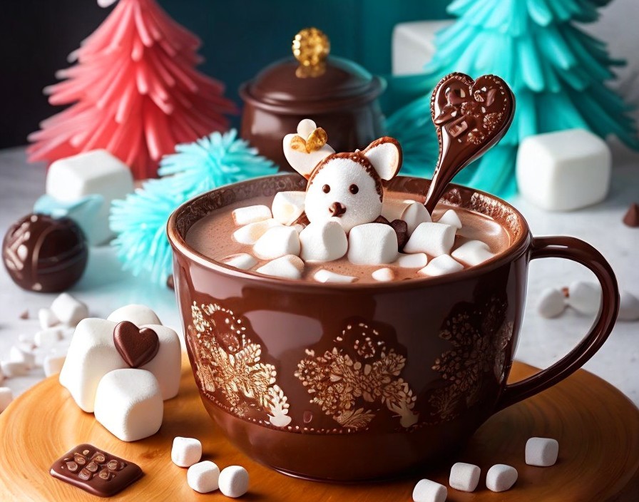 Festive hot chocolate mug with chocolate mouse and marshmallows