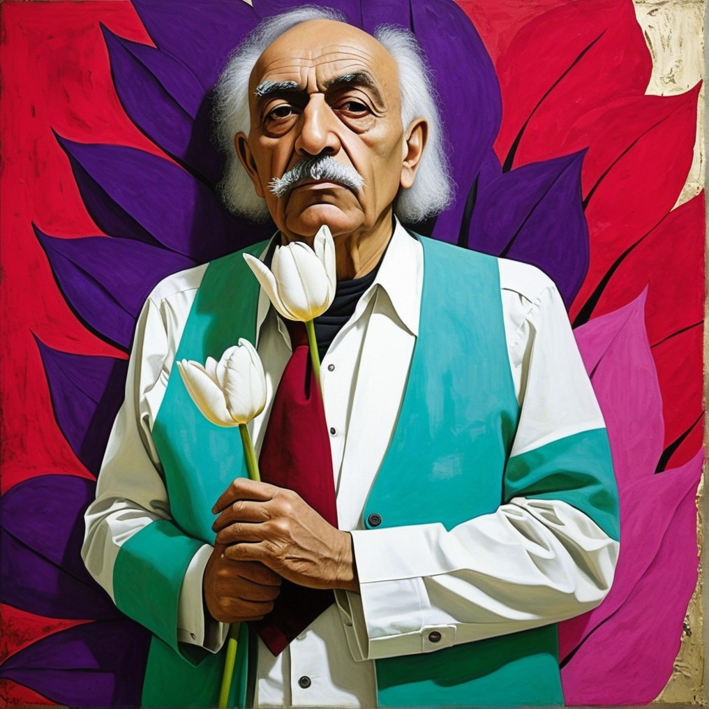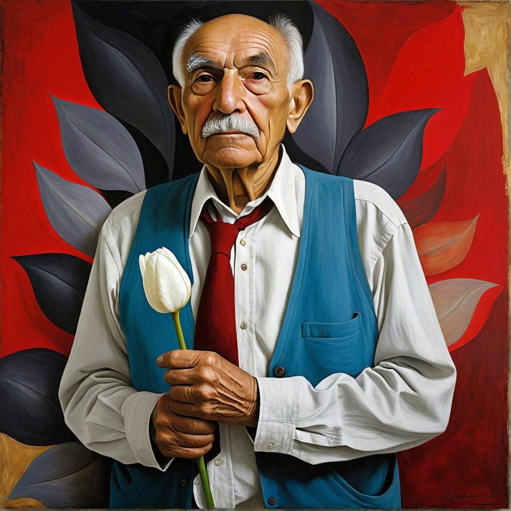 An aged man stands before a backdrop of abstract, petal-like shapes in warm reds and cool blacks. He clutches a white tulip with both hands. Dressed in a red tie and blue vest, his gaze is solemn, thoughtful. The vivid yet orderly backdrop echoes memories and unspoken truths.