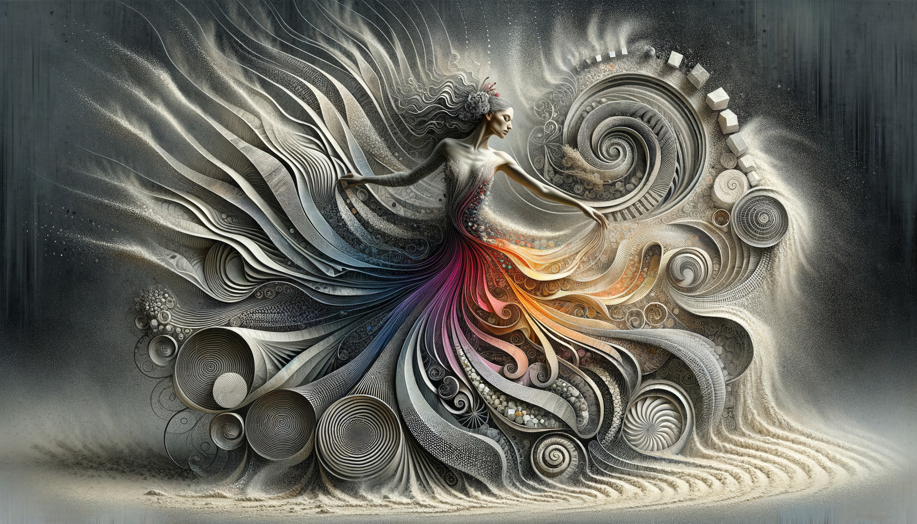 A stunningly imaginative close-up poster illustration of a flamenco dancer. She is completely wrapped in a flowing dress made of intricately designed sand particles, swirling and cascading around her form like an abstract sandstorm. This is a masterful surreal vision of what art would look like if the wind painted with its tools: watercolor, fine crystal dust, and sand particles. The wind harnesses the collective dynamism of the sand, swirling and gusting to create fascinating spirals and designs. The dress is a fusion of silkiness, fine particles, hyper-realistic and varied textures bits of glass, string, flowing silk, and mesmerizing designs with a shimmering moiré effect. Everything moves with the wind, a dance of sketching, pointillism, line art, stacked and running parallel lines. An insane array of texture brushes brings the scene to life with hyper-detailed, intricate, elegant, and multi-dimensionally layered artistry. The artist incorporates elements of patterns, textures, the Fibonacci sequence, sawtooth waves, and woven sand. The detailed whirling sand and the woman's form are central to the composition, bathed in incredible visionary colors and textures.