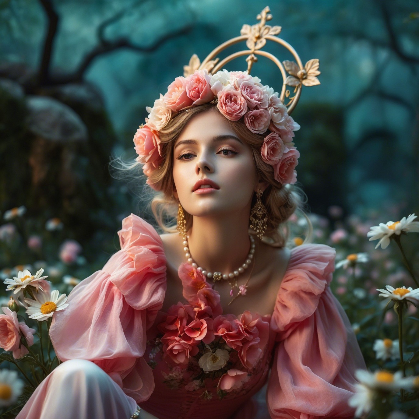 A young woman adorned with a floral crown and intricate jewelry gazes serenely. Her pink gown contrasts with a dreamy forest backdrop, blooming with daisies and ethereal light.