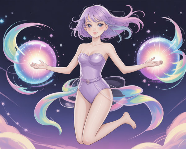 A celestial being adorned in vibrant cosmic colors, embodying the beauty and power of the universe. She radiates starlight, inspiring awe and wonder as she navigates the vastness of space.