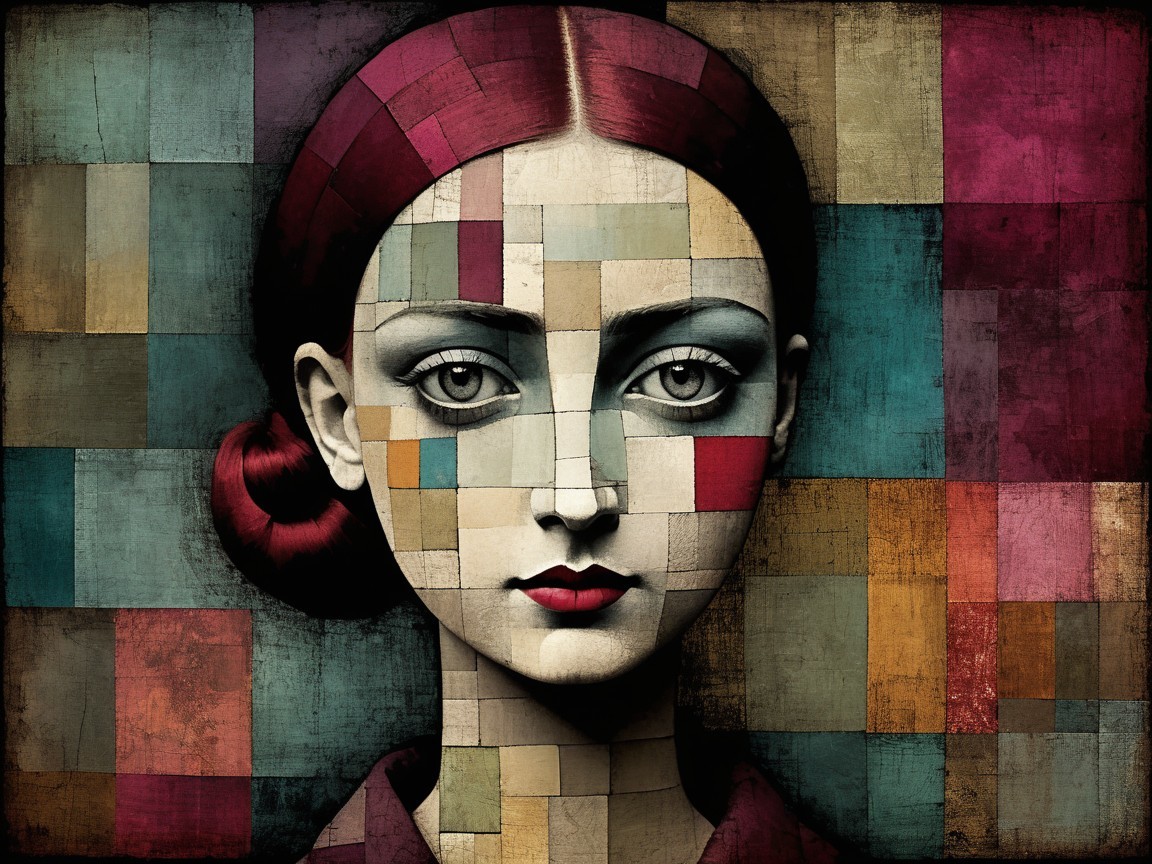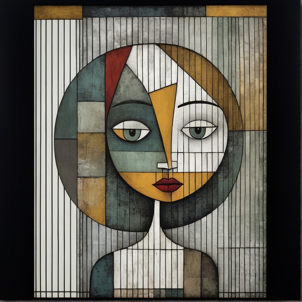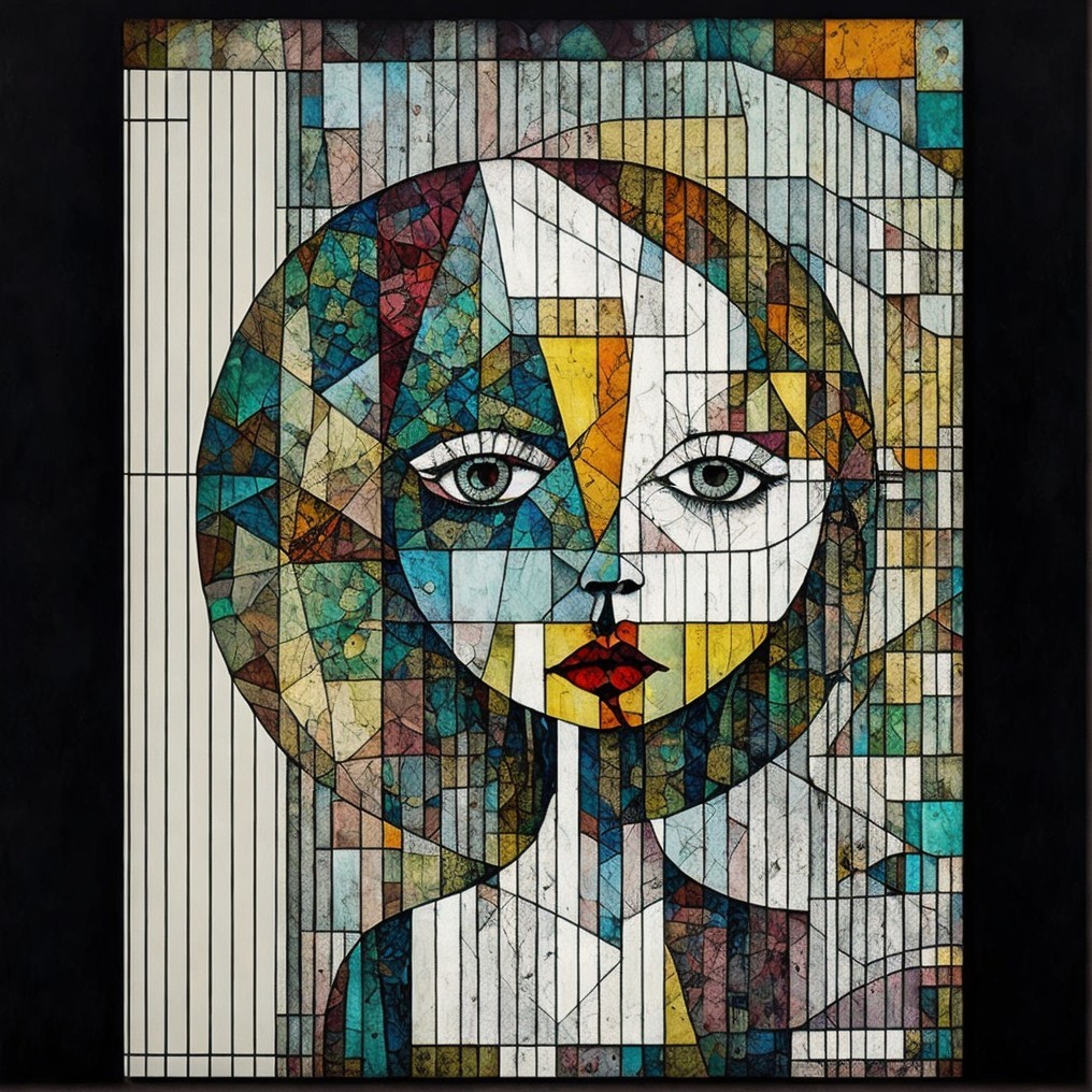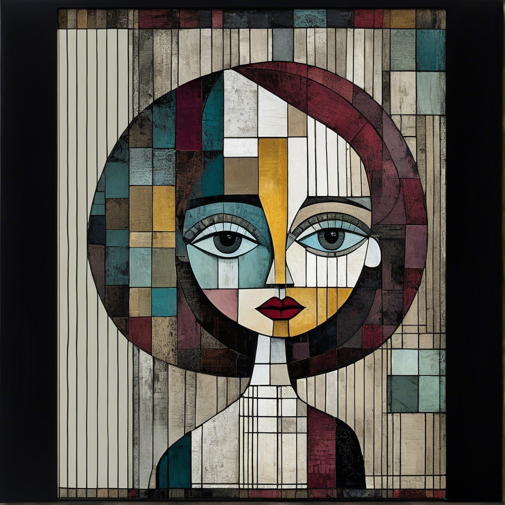 The artwork features a stylized female face divided into geometric shapes with muted colors. Her striking eyes and bold red lips create a captivating focal point within the framed composition.