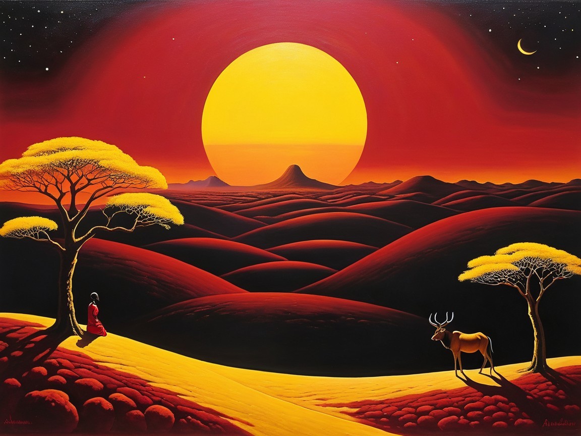 A vibrant sunset casts a yellow glow over rolling red hills, silhouetted by dark mountains. Two trees frame the scene, while a lone deer stands peacefully in the foreground, enhancing the serene landscape.