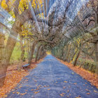 A serene path lined with twisted trees, their branches glowing with vibrant autumn leaves. A lonely bench sits amidst a carpet of orange foliage, inviting peaceful reflection.