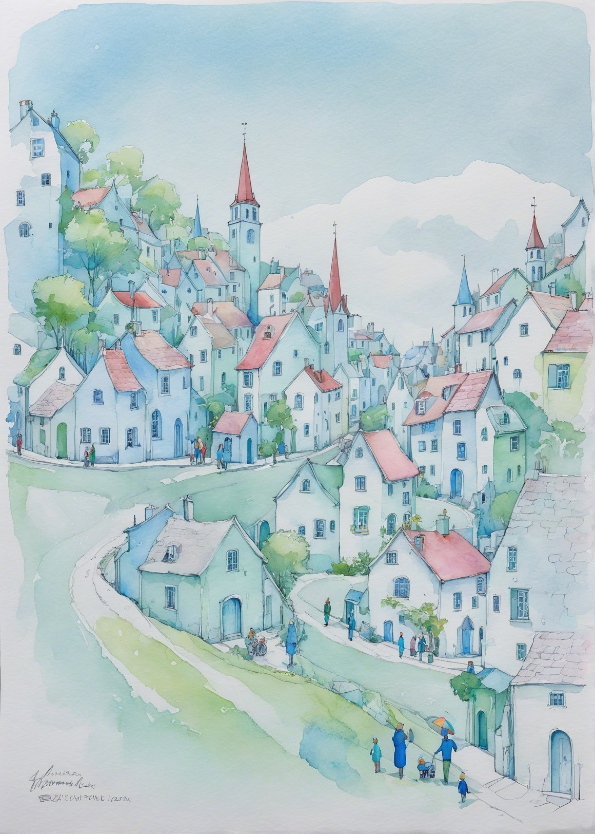 A whimsical village scene featuring colorful houses with sloped roofs and a tall church tower. People stroll along a winding road, surrounded by lush greenery and a soft, misty atmosphere.