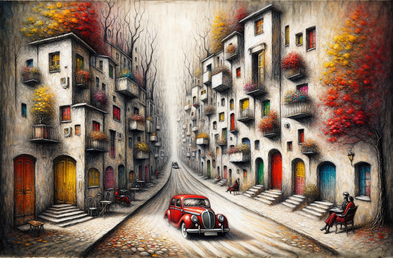 A whimsical street scene features colorful buildings adorned with flowers. A vintage red car drives down a cobblestone road, while people relax on benches, surrounded by autumn trees.