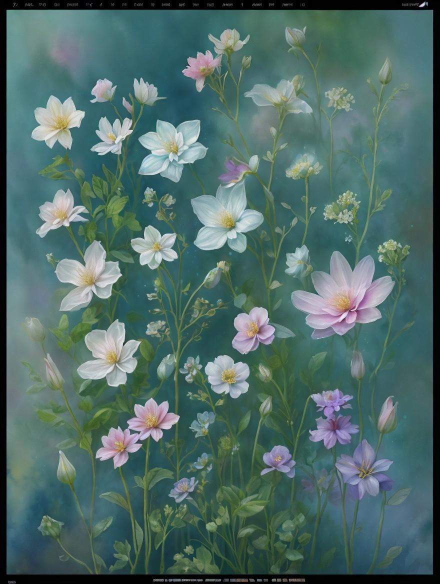 Prompt: Watercolour of ethereal flowers from a fantastical realm, exhibiting translucence and fragility, crafted from mesmerizing blossoms and luminous drapery, sparkling with otherworldly charm, full-body portrayals with glass-like colour textures gleaming as if moist, 3D digital painting with painstakingly detailed creation, delicate texturing, high-resolution clarity, a realistic depiction with impeccable colour balance, precision lighting, noiseless image quality, edge crispness, flawlessly composed, vignette