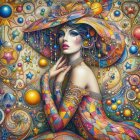 A beautifully illustrated woman in a vibrant, patterned gown and a wide-brimmed hat adorned with jewels. The background features intricate swirls and colorful orbs, creating a whimsical atmosphere.