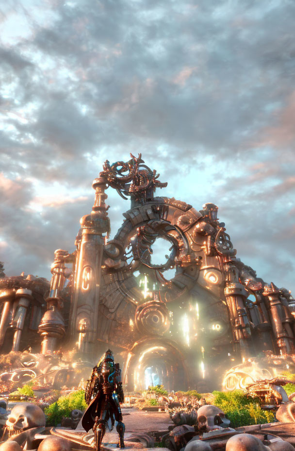 Prompt: biomechanical cyborg, stargate portal, infinity pool, Cthulhu alien, in a cave, surrounded by ruins, surrounded by bones, surrounded by skulls alien artifacts, future tech, dystopian, cyberpunk styles, h.r. giger styles, just make the sky a cave