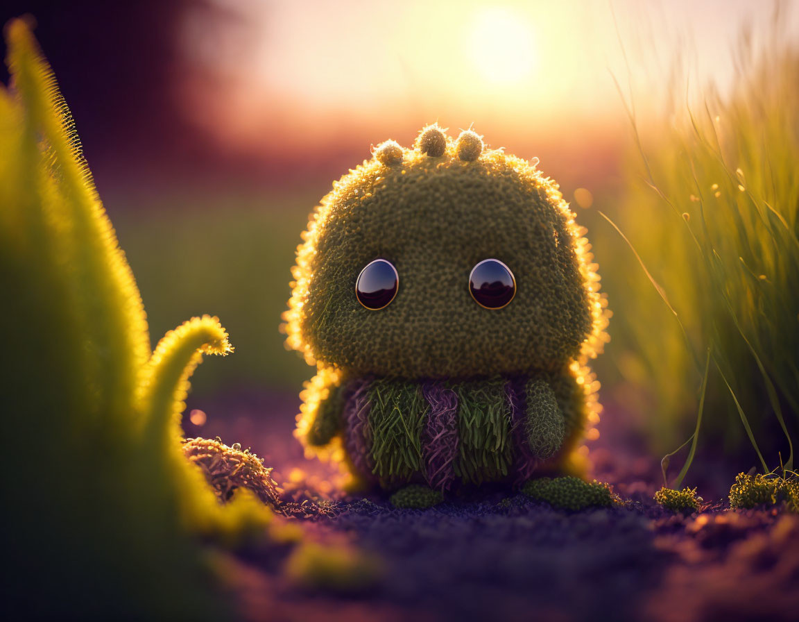 Green plush creature with big eyes in sunset-lit grassy terrain