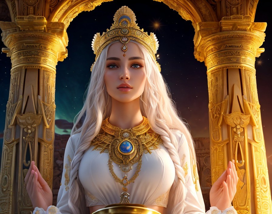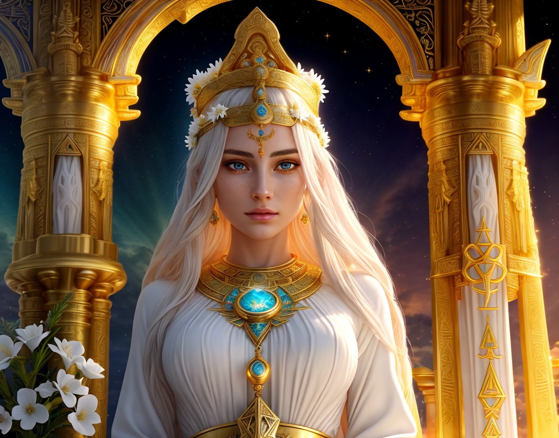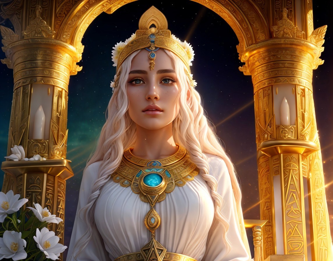 Atlantean Priestess with radiant beauty, beautiful face with high definition human features and beautiful eyes, hyper realistic, super detailed, goddess energy, full of grace, with radiant light sing down upon her head. Delicate gold jewellry around her neck. Praying at the altar inside an ancient temple. On the altar are vases of white flowers, a golden ankh symbol open sky, sunrise, insanely detailed and intricate, ornate, dynamic, elegant, hyper realistic, super detailed, vivid colors, 8K. phosphorescence light, angelic light