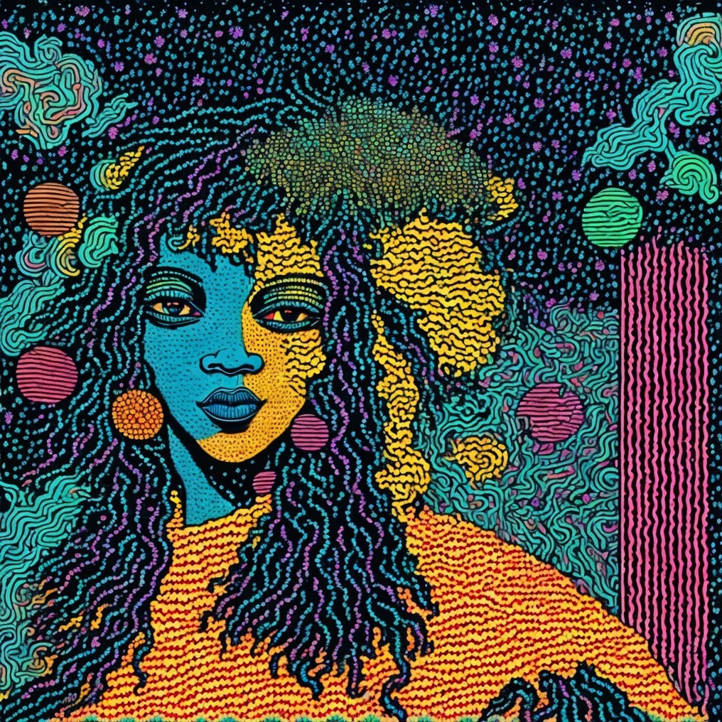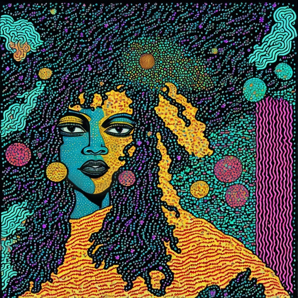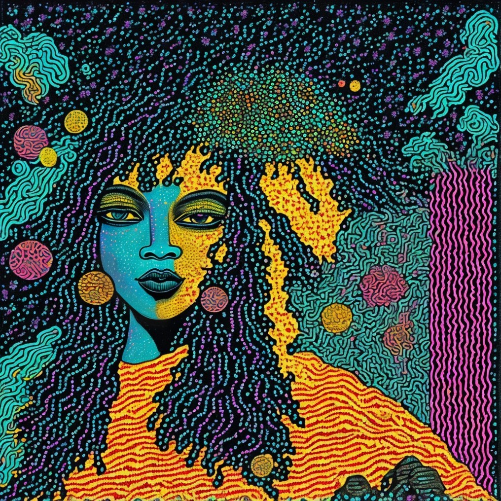 A full-length afro-woman emerges mid-ritual, her body and hair dissolving into neon pointillist constellations. With painterly elegance and tribal force, she evokes ancient powers in a glowing sorceress rain dance, suspended in psychedelic reverence and storm-born spirit.