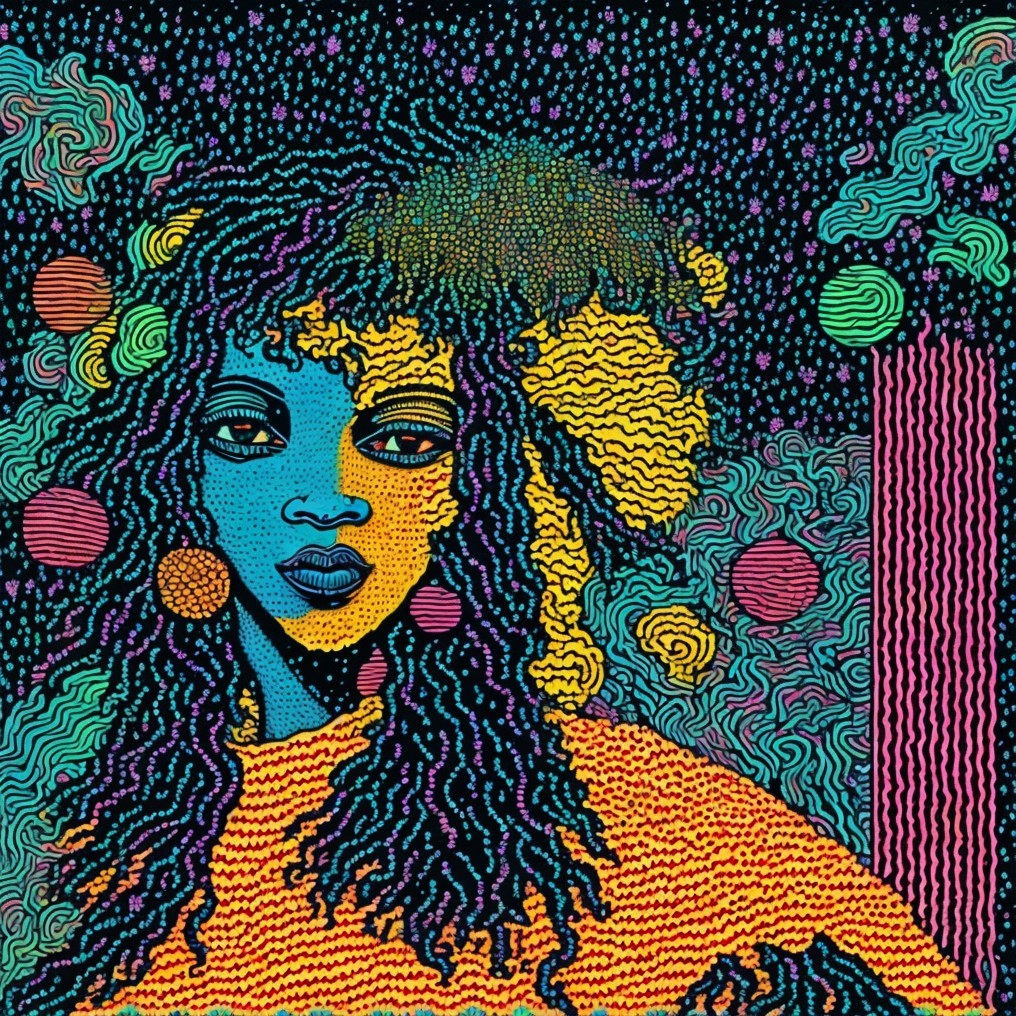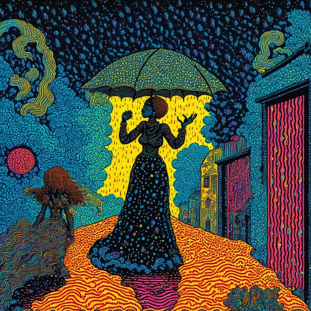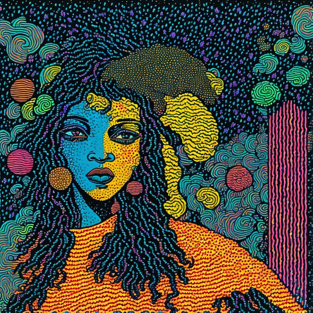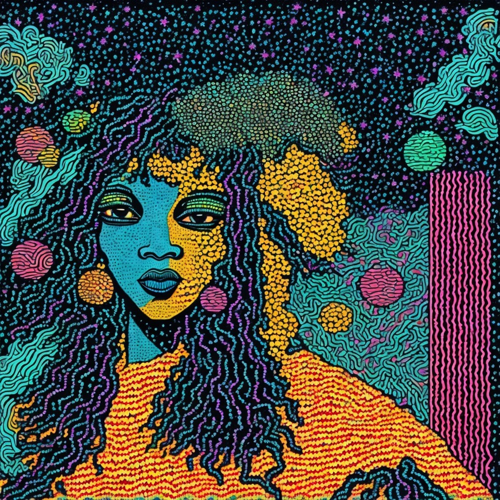 A full-length afro-woman emerges mid-ritual, her body and hair dissolving into neon pointillist constellations. With painterly elegance and tribal force, she evokes ancient powers in a glowing sorceress rain dance, suspended in psychedelic reverence and storm-born spirit.