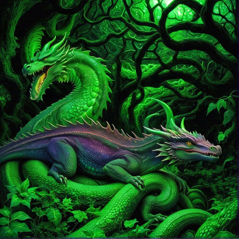 A vibrant, mystical forest scene featuring two majestic dragons entwined among twisted trees. One dragon is emerald green, while the other shimmers in blue and silver, exuding an enchanting aura.