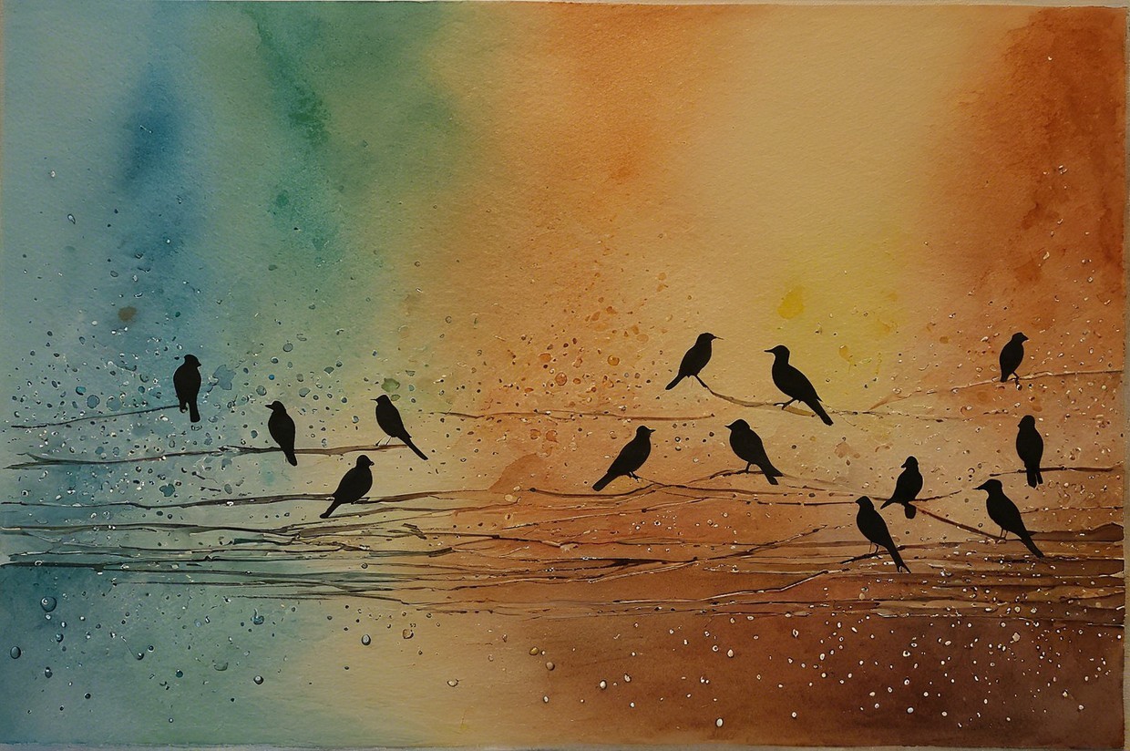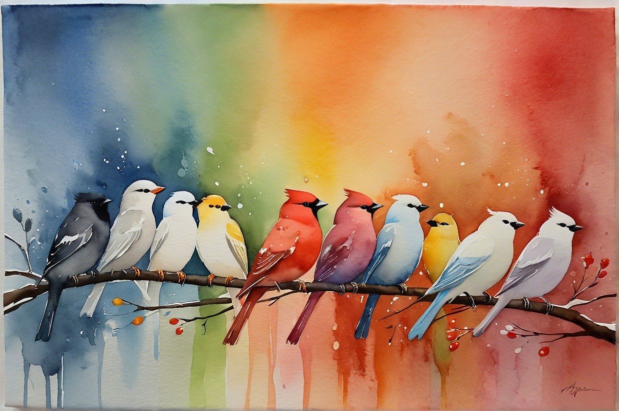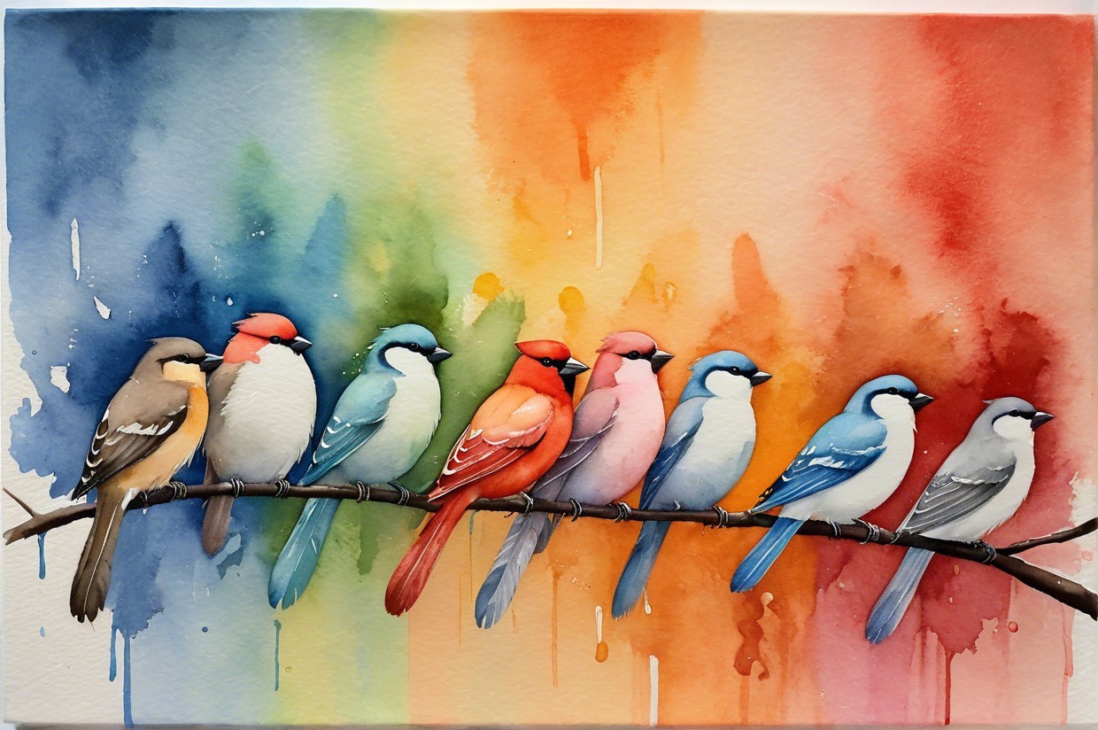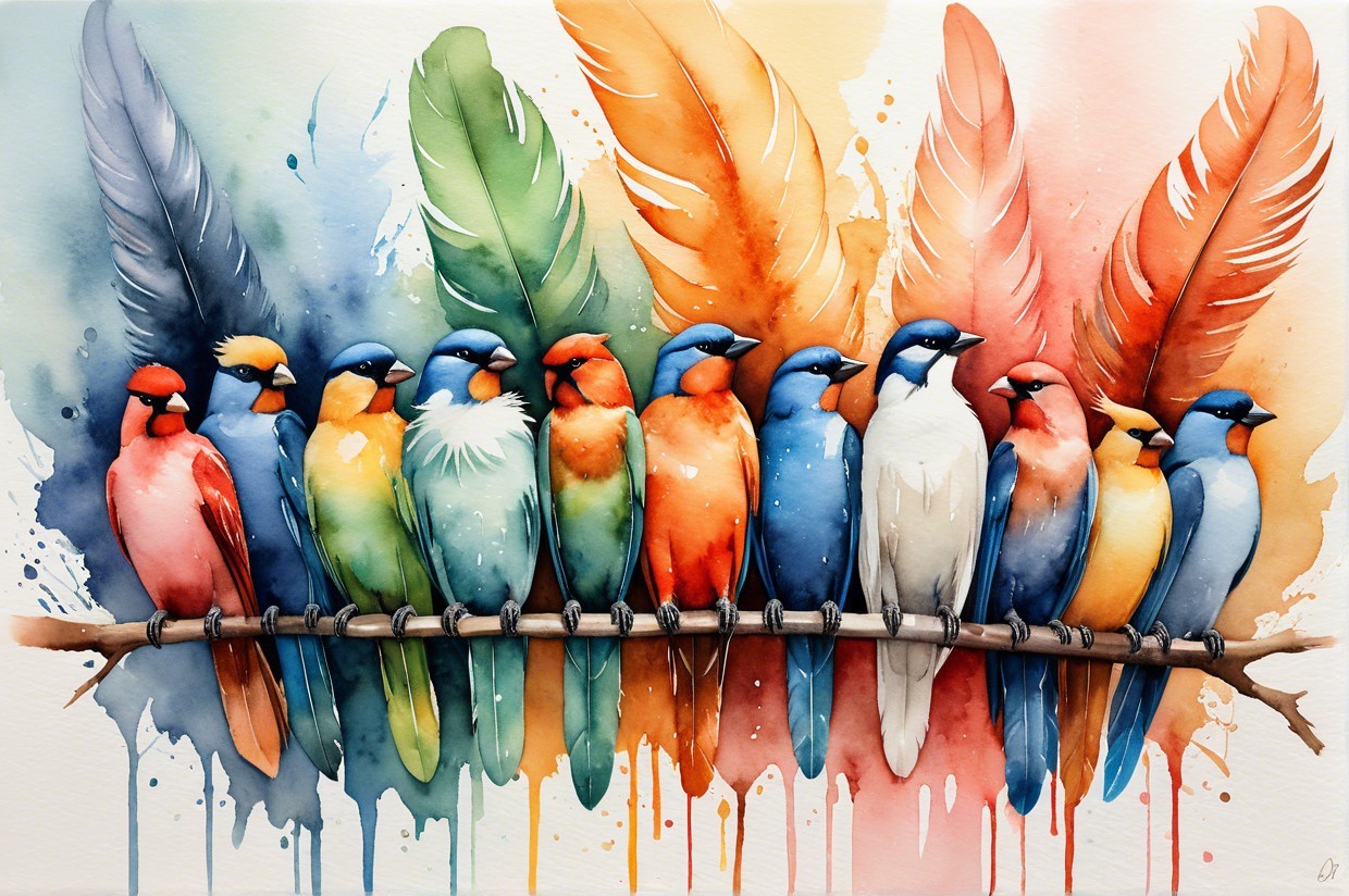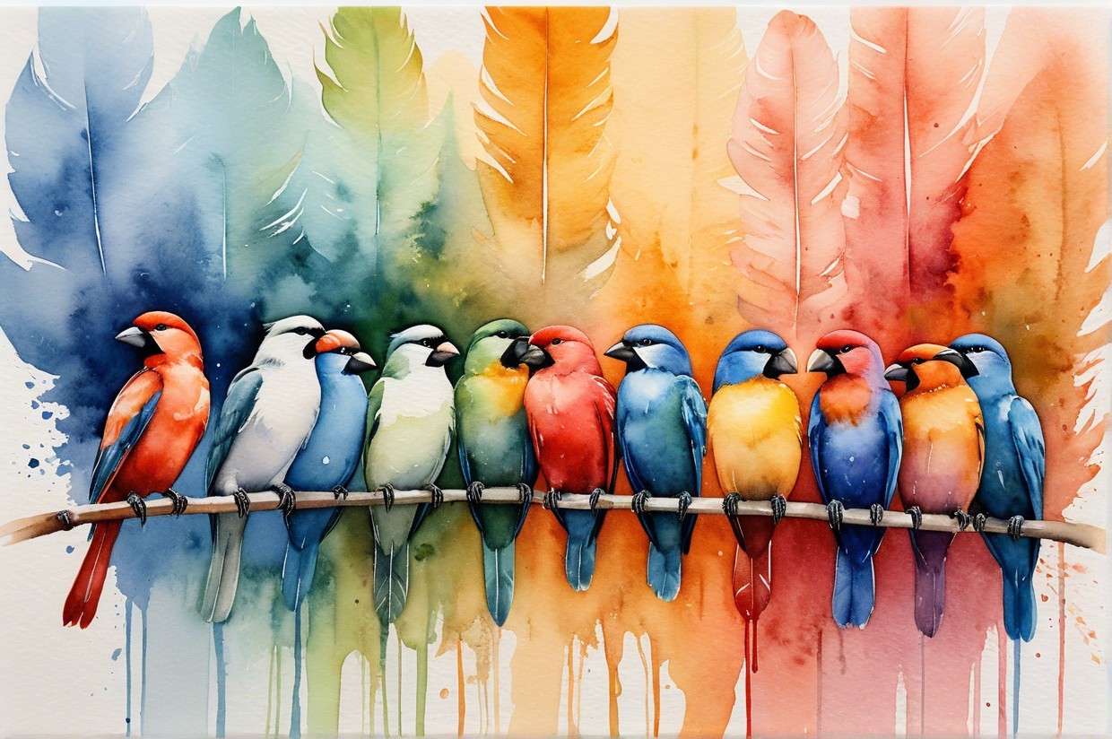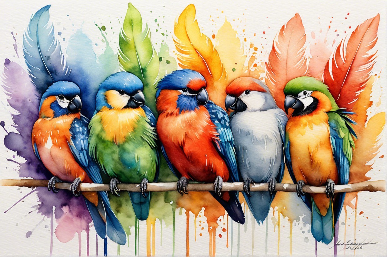 A vibrant watercolor illustration of five colorful parrots perched on a branch, each showcasing bright feathers in blue, green, yellow, orange, and red, against a splashy, abstract background.