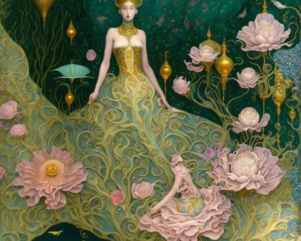 A mesmerizing dreamscape filled with ethereal figures on vibrant, flowing forms. Ornate lanterns and celestial elements float amidst a serene blue backdrop, creating a whimsical, enchanting atmosphere.