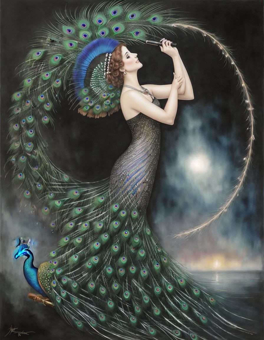 A woman in an elegant peacock-themed gown holds a mirror, standing near an archway with a view of a setting or rising sun.
