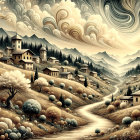 A serene winter landscape features a winding river beside ancient ruins atop a rocky hill, surrounded by snow-capped mountains and forests under a dramatic, cloudy sky.