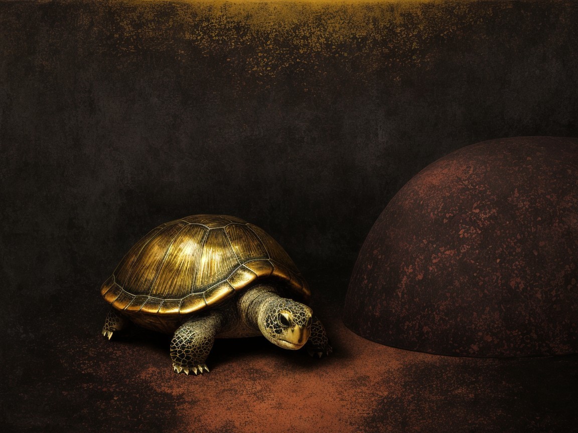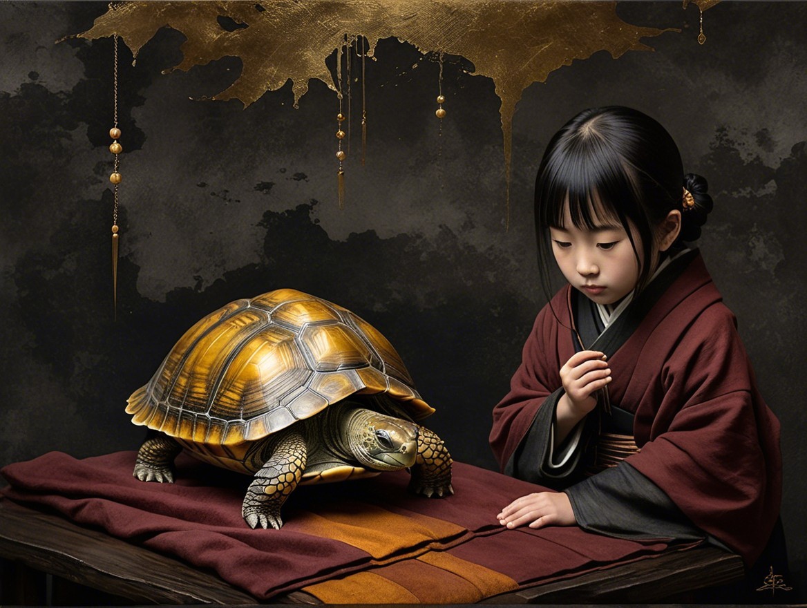 Prompt: "Legend of the Girl and the turtle , Medieval Japanese Artists Sumi-e Style, Velvet maroon, Shabby, Dull Gold, Amber Gray, . dramatic