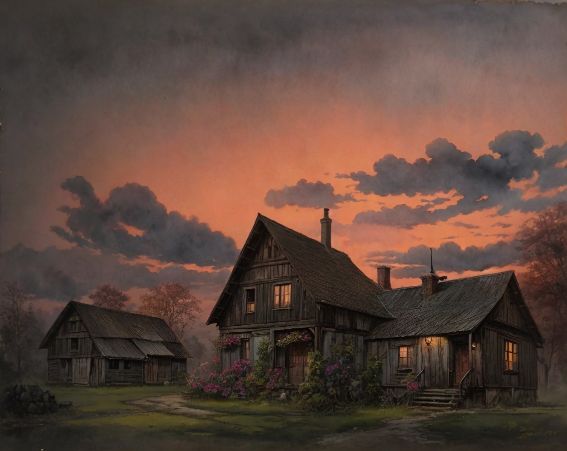 Rustic wooden houses under dramatic sunset sky with warm light.