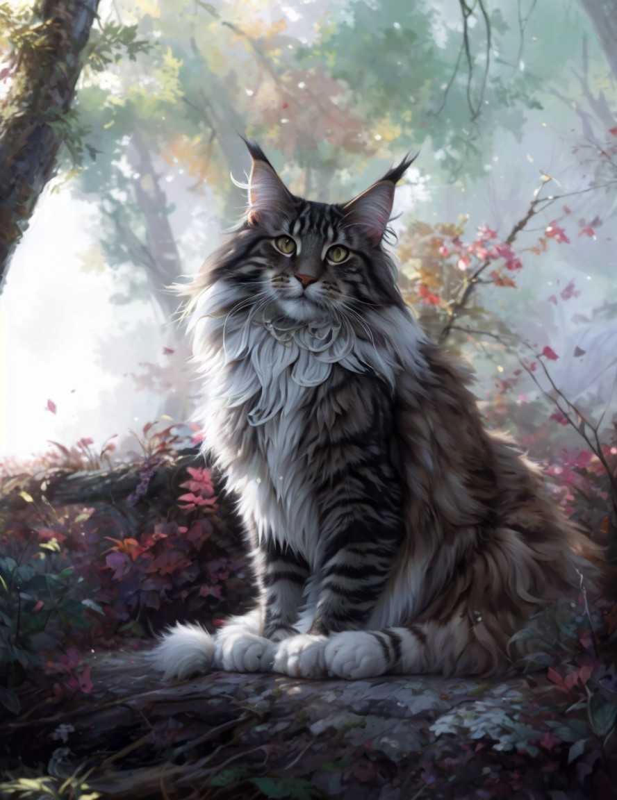 + Prompt:Forestscape, Maine Coon, very fluffy, cute and happy, correct proportions, Speedpaint with large and medium brush strokes by ernst haeckel, Ismail Inceoglu; Gazelli, robert oxley, paint splatter; paint drips; a masterpiece; 8k resolution; trending on artstation; highly detailed and intricate