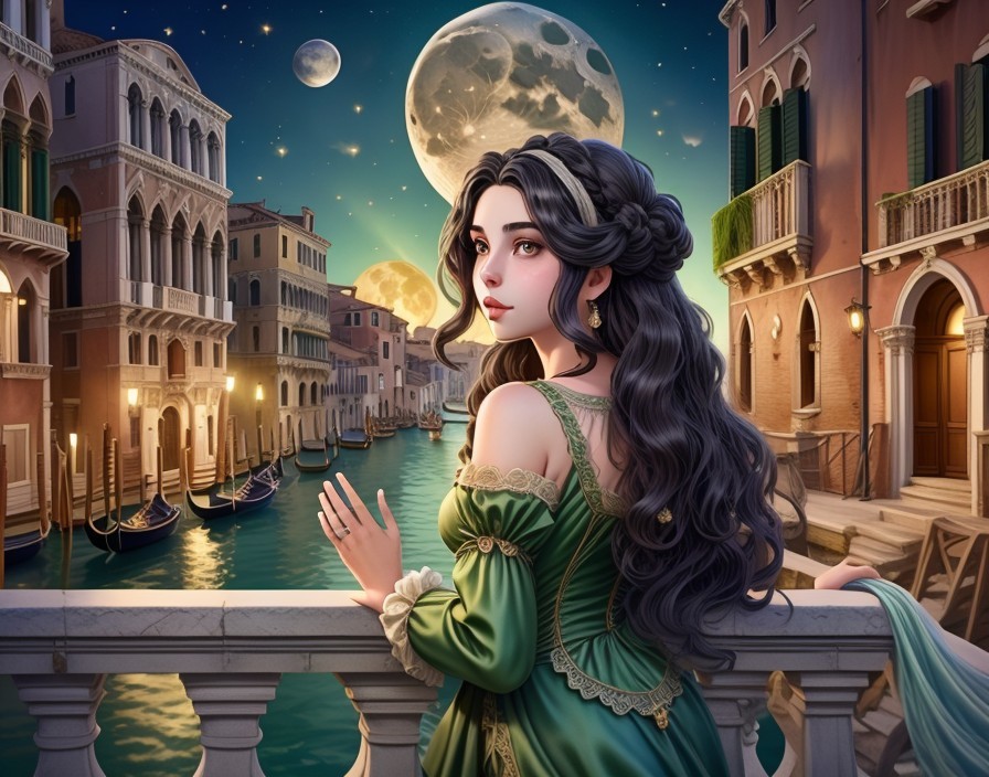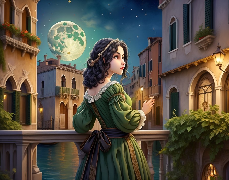 An illustrated woman with wavy hair stands on a Venice bridge at night, gazing at a moonlit canal, surrounded by Renaissance architecture.