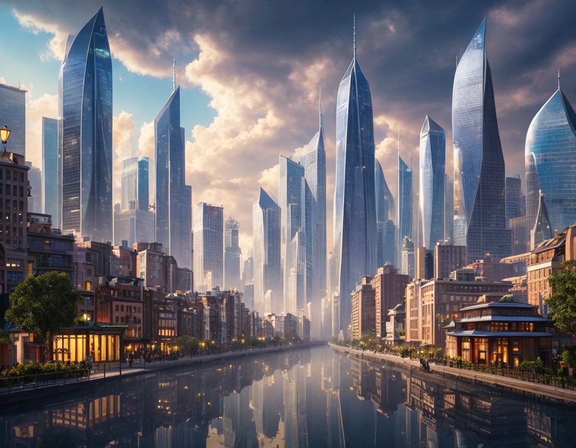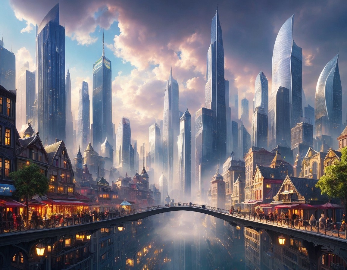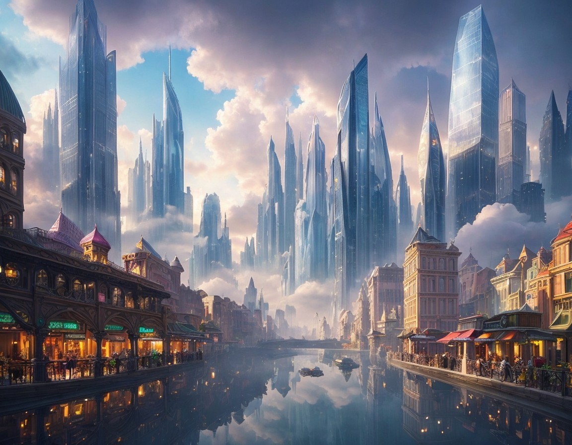 Big dreamy, warm city with skyscrapers that touch the Cloudy sky. In the sky, there are other plannets floating, and beautiful stars. Magical creatures live in the city. There are magical bridges, stores, cars floating around. You can see the people in this city, they all look busy and fairy like.