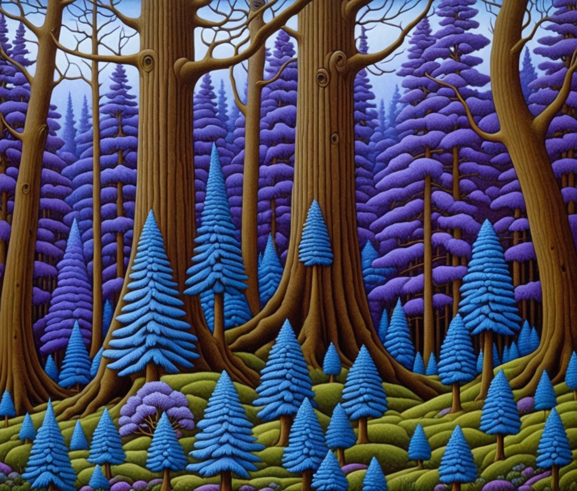 A vibrant forest scene featuring tall trees with thick trunks and a mix of purple and blue evergreens. Rolling green hills and distant mountains create a whimsical, colorful landscape.