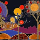 A vibrant, abstract landscape features three uniquely styled trees with colorful foliage against a dark background. A bright sun rises above rolling hills, creating a striking, whimsical scene.