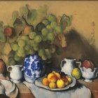 A still life featuring vibrant peaches, grapes, and elegant ceramic vases with floral designs, set against a warm background. A wooden table enhances the inviting, tranquil atmosphere.