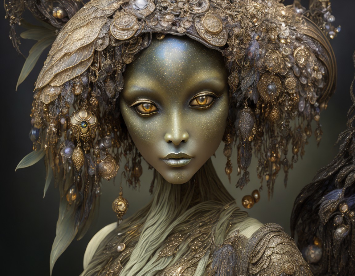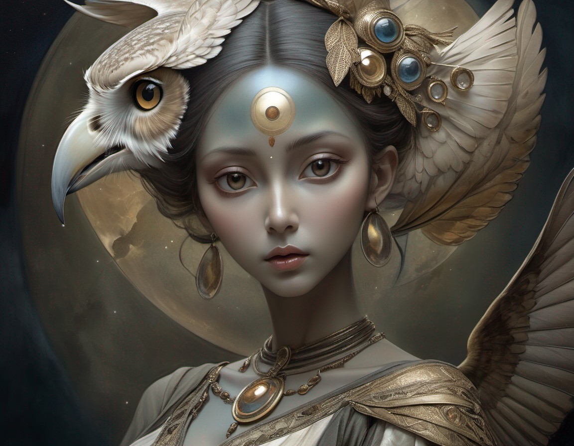 A woman with an elaborate owl-themed headdress, large eyes, and ornate makeup conveying a mystical aura.