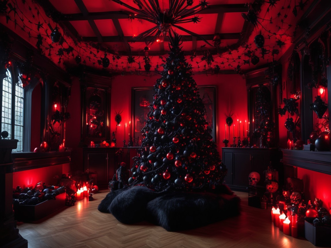 A dimly lit room features a large, dark sculpture of a seated figure, surrounded by haunting portraits. Red walls and warm candlelight create an eerie, introspective atmosphere.