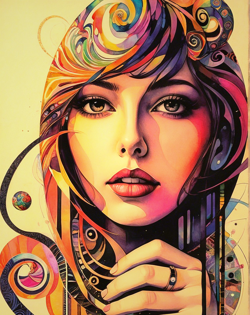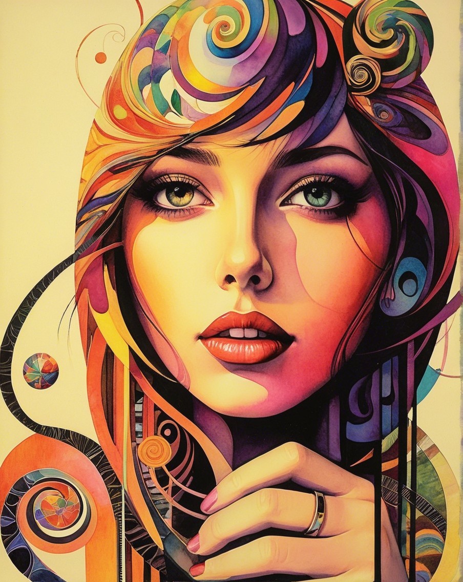 headshot consisting of panels and bold strokes and vibrantly abstracted swirls, dynamic spheres, vivid spirals, cymatics and catenaries, fractals, negative lucas number, mip-mapping, texture shading, very multicolored palette, watercolor background, blooming and fading elements, symbolism of fleeting moments, pen and ink illustration by Tim Burton, dreamy surrealistic style, wet-on-wet watercolor and ink technique, golden hour lighting.diffused warm golden light, anisotropic filtering, texture mapping, subsurface scattering, unique, misplaced reflections, hues by Ho Baron, ethereal glow, compelling gradient inking, overexpsed, low key lighting, RGB shifts and vertical scanlines, digital decay effect, displacement mapping, plasmatic hatchings, scratched edges, cel-shaded style, Henri de Toulouse-Lautrec influence, Bloom-Effect, interpolated, subsurface scattering, casually textured layers, anti-aliasing,tiny fabric patterns, crackles, catenaries, divisionism, colorful yam, ((warm coloring, (earth tones, dark-yellow, metallic-honey) 9:15),