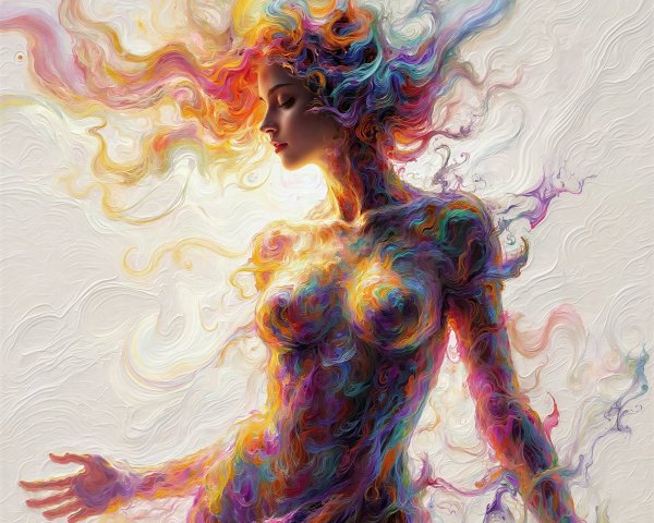 The image features five women with painted bodies, each a different color, against a surreal backdrop of celestial elements and a fantastical castle. Their expressions convey a sense of unity and mystery.
