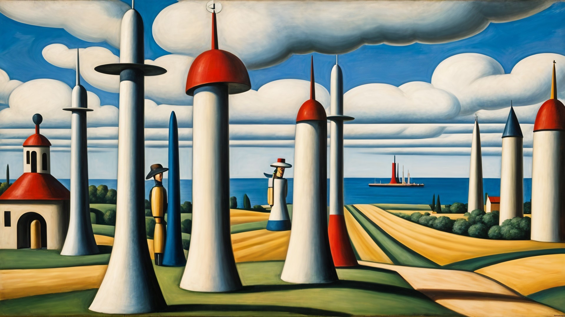 The image features a vibrant landscape with tall, colorful towers against a backdrop of rolling hills and a serene sea. The sky is dotted with fluffy clouds, adding a sense of depth and calm.