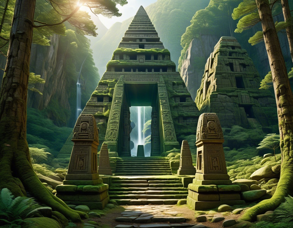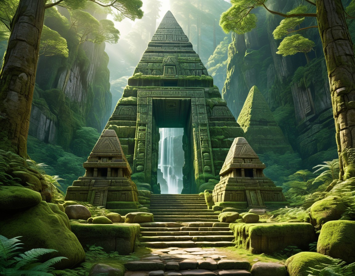 A majestic pyramid rises amidst towering cliffs and lush trees, with ancient carvings adorning its entrance. Two silhouetted figures stand at the base, gazing toward a mysterious light inside.