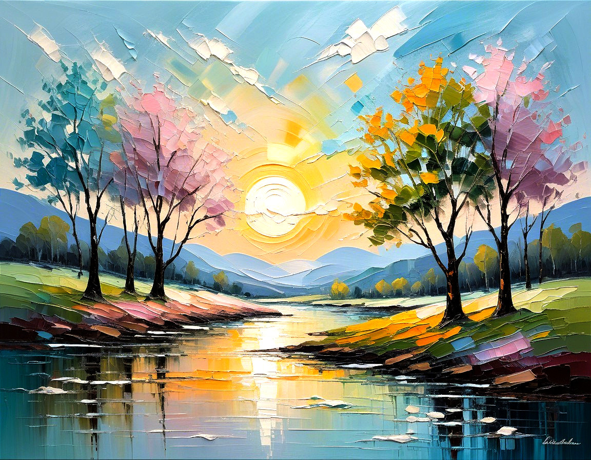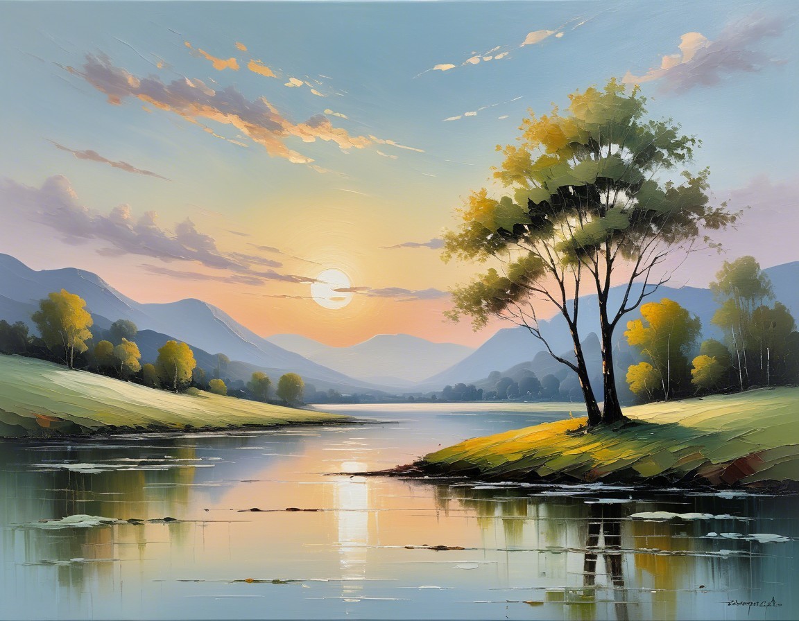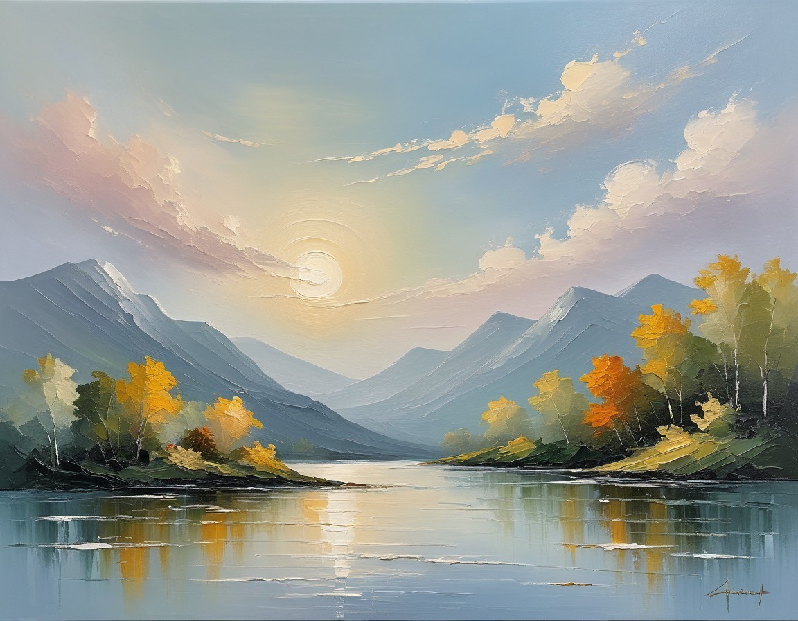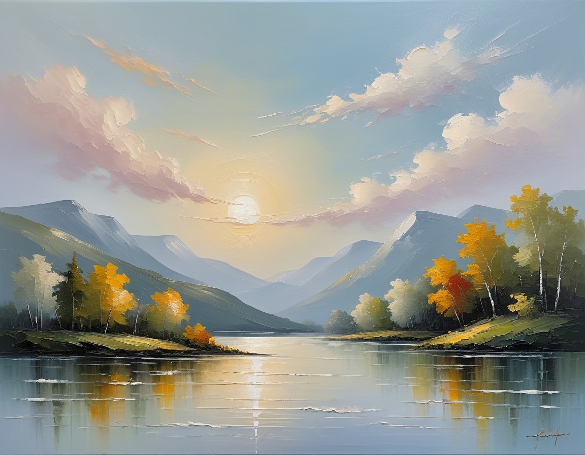 A serene landscape at sunrise, featuring a calm lake reflecting colorful trees in shades of pink and green. Four ducks swim gently, adding a lively touch to the tranquil scene.