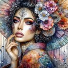 A stunning portrait of a woman with vibrant makeup featuring colorful patterns and flowers. Water droplets glisten on her skin, enhancing the mesmerizing, artistic expression of the image.