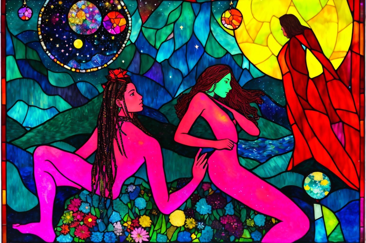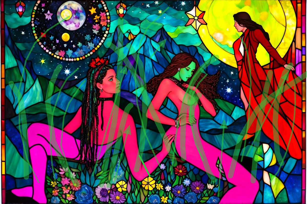 + Prompt:highland flower spectacular, pines and beautiful aspen trees by a river, cosmic night sky with a full bright large moon and stars, made of mixed media, acryllc, stained glass and metallic paints