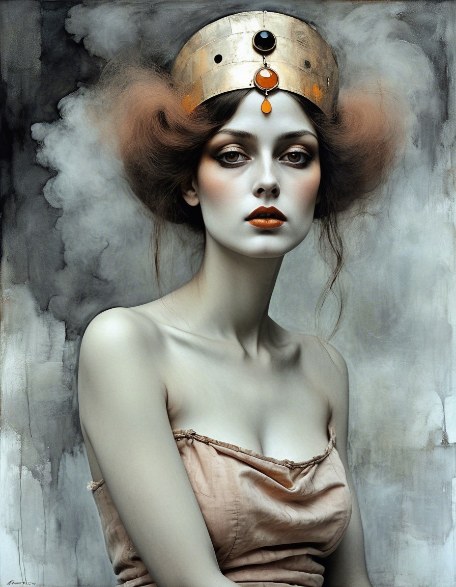 Queen of Halloween. foggy nostalgia, portrait in Burnt umber and salmon gold, smoke and mirrors, patina of, battery acid, art brut, moody, somber, desaturated colors, in the style of Paul Klee, Arthur Rackham Dark and moody oil painting of a woman with piercing black eyes, inspired by the works of John Singer Sargent and Edgar Degas, long shot, realistic texture, dramatic lighting, intricate details on clothing and Magical woman fading tones of melancholy and summer nostalgia, soulful portrait, in burnt umber, plutonium, patina of mercury glass, tea stains, art brut, moody, somber, desaturated colors, in the style of Paul Klee, Banksy, Arthur Rackham, based on Prompt by KRW