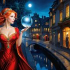 A woman in a vibrant orange dress holds a fruit, set against a swirling night sky. Venetian buildings line a canal, with gondolas and figures strolling, evoking a dreamlike atmosphere.