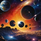 In a stunning cosmic scene, three figures stand on a celestial landscape, gazing at vibrant planets and swirling galaxies, illuminated by a brilliant orange light. The vastness of space surrounds them.