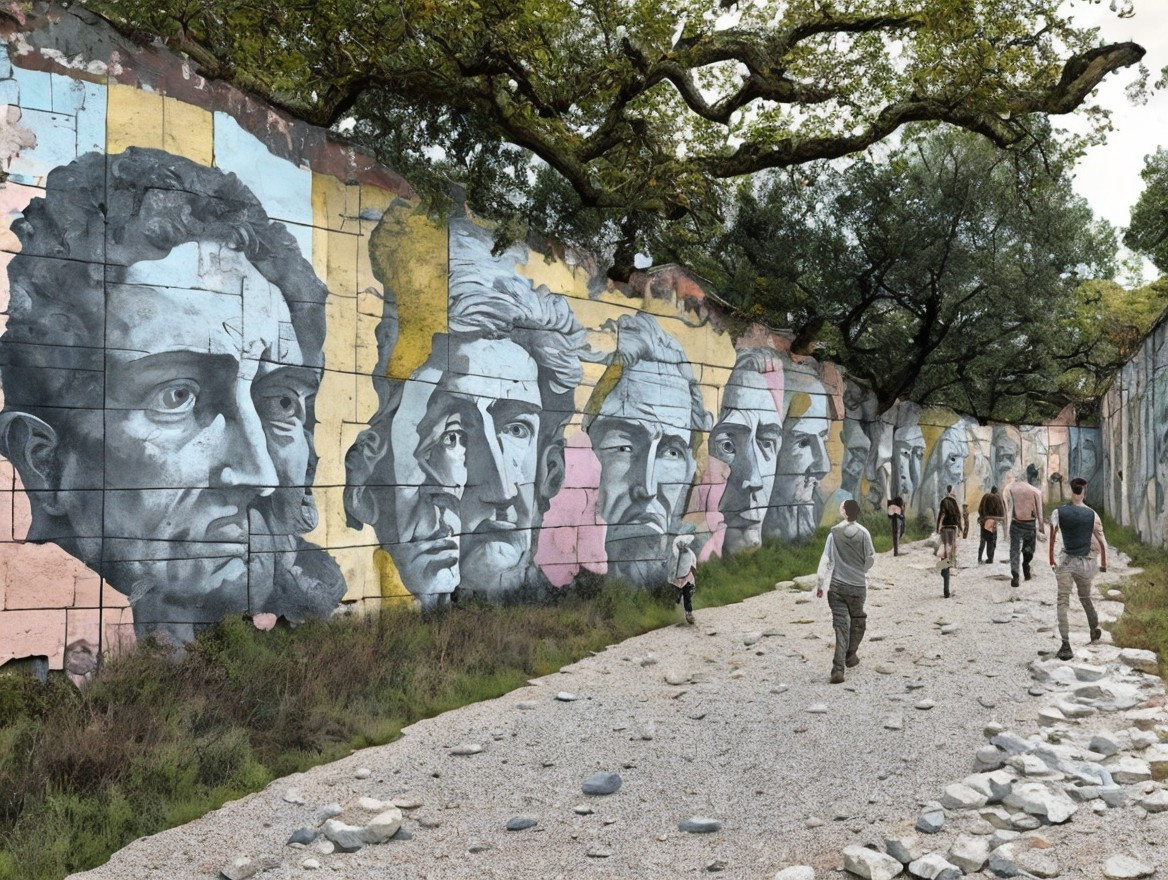 Prompt: Michelangelo style, a high painted wall with portraits of pensive looking historical citizens, in pastel colors and grey which get smaller and smaller all the way to the back, of expressive middle aged people, walkers, men, women on it, realistic and various facial expressions, weathered, peeling paint, gravel path with small and large stones, walkers, aged and weathered appearance, tall gnarled trees with twisted branches, dense foliage, dappled sunlight filtering through the leaves, vintage aesthetic, muted sepia, brown and cream, pastel tones, textured brushstrokes, old world charm, soft and diffused light, traditional art style, inspired by and by Egon Schiele