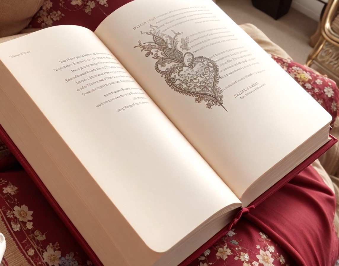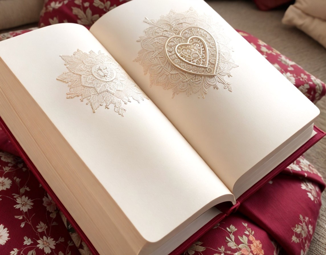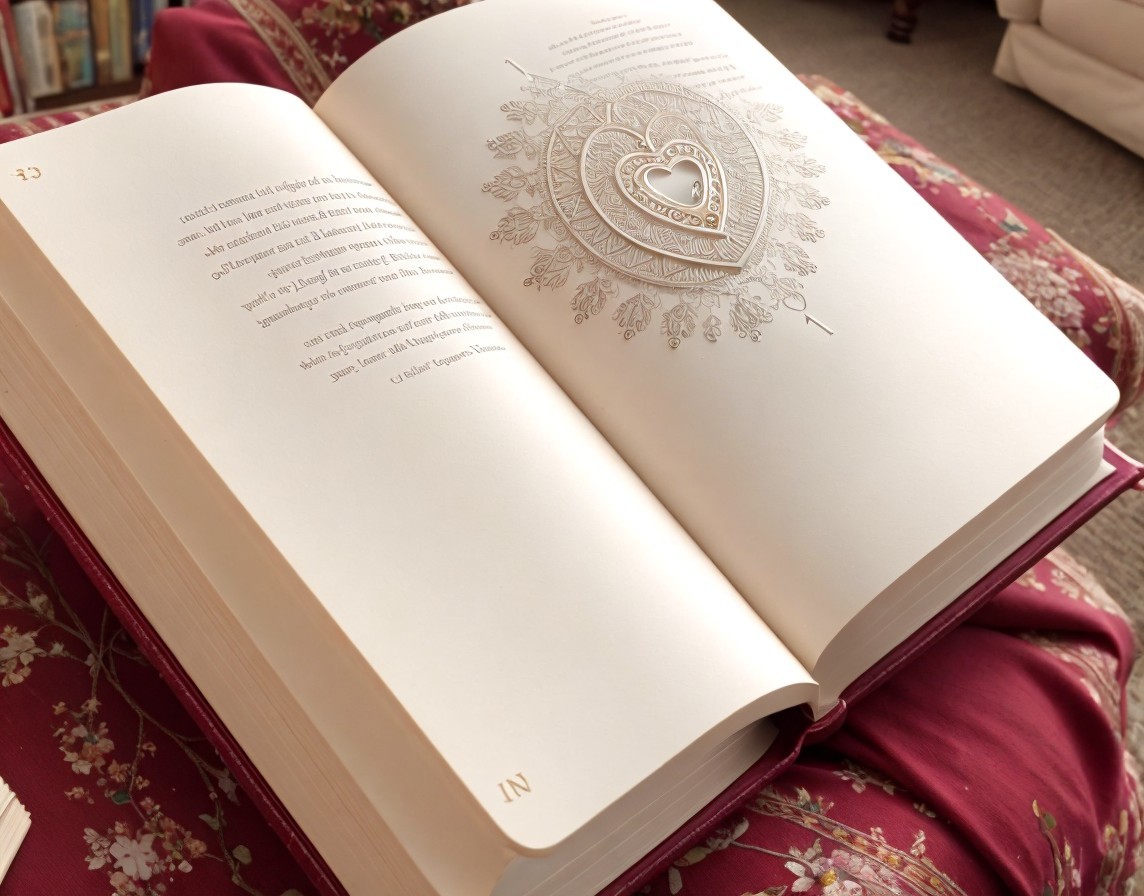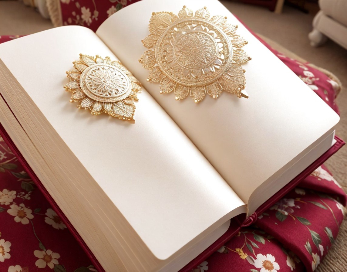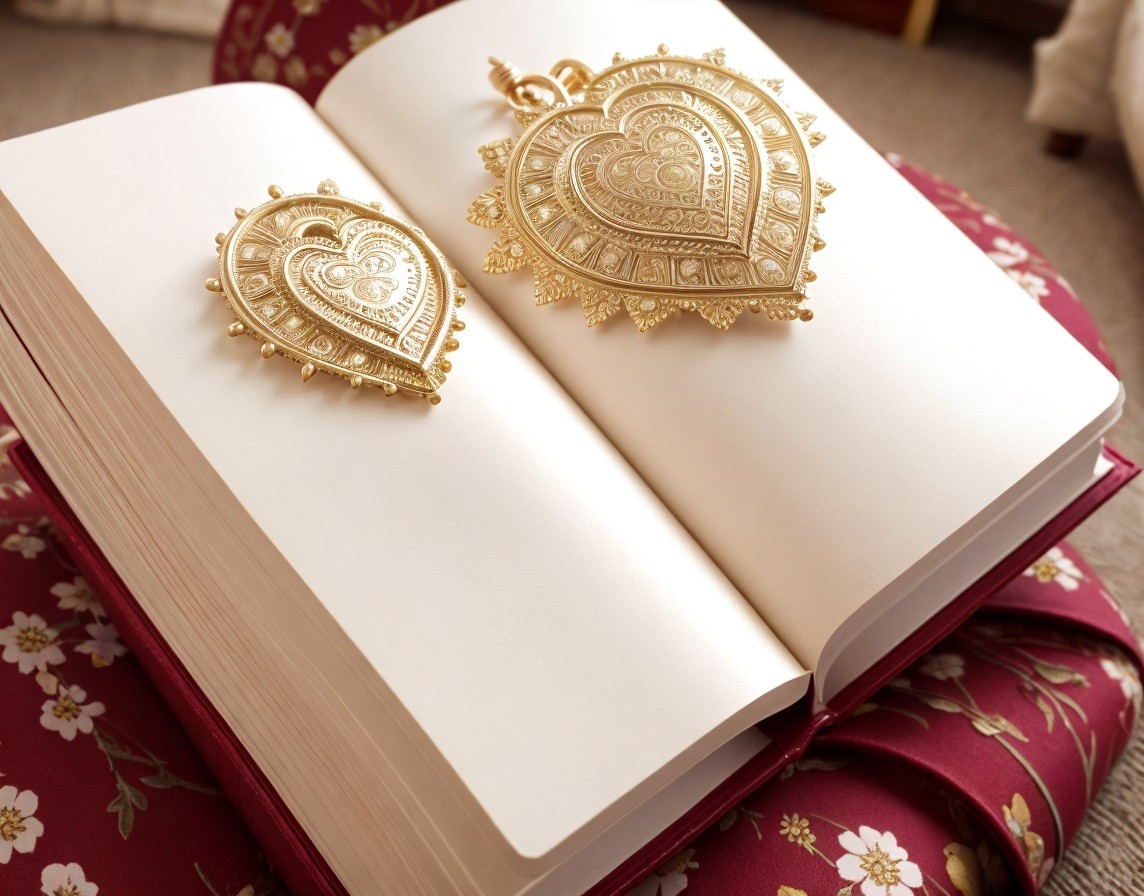 An open book with blank pages and two ornate golden heart lockets resting on top against a floral background.