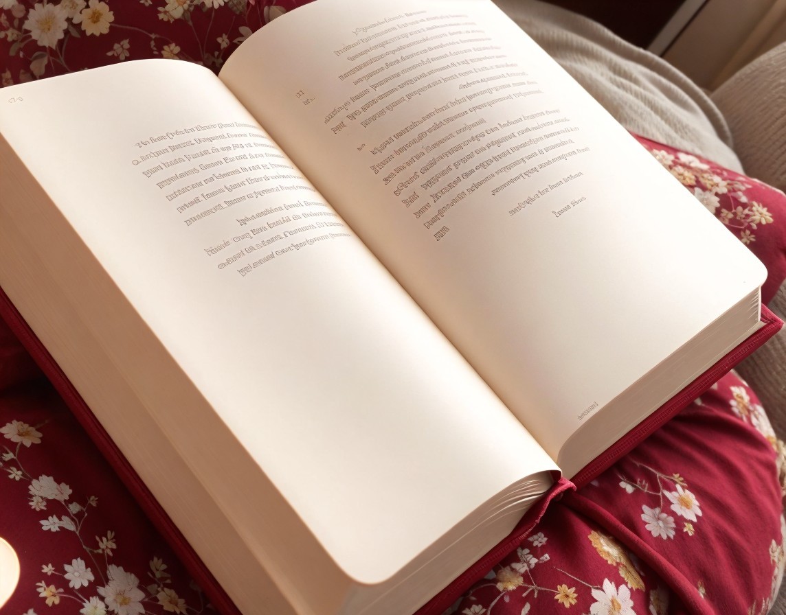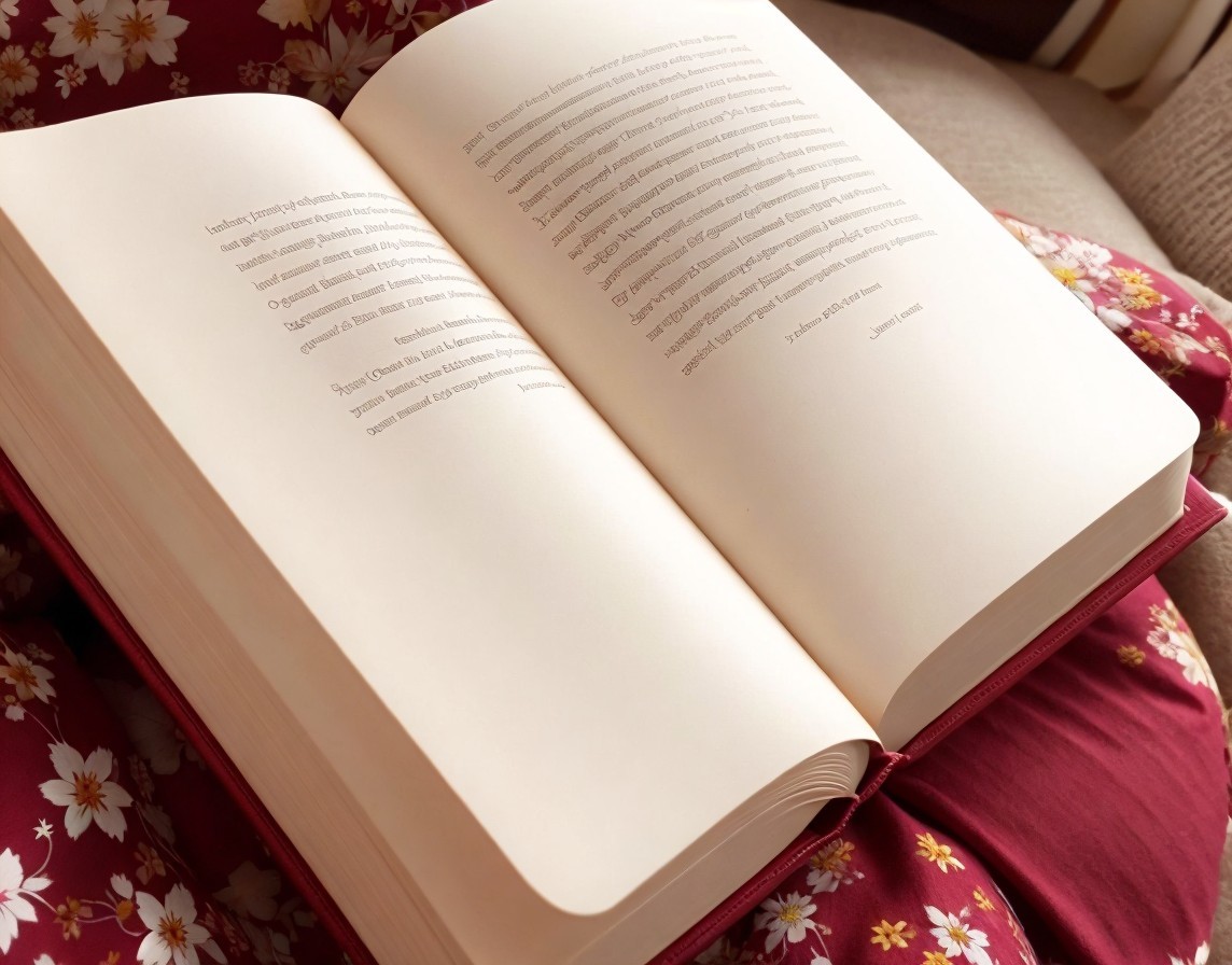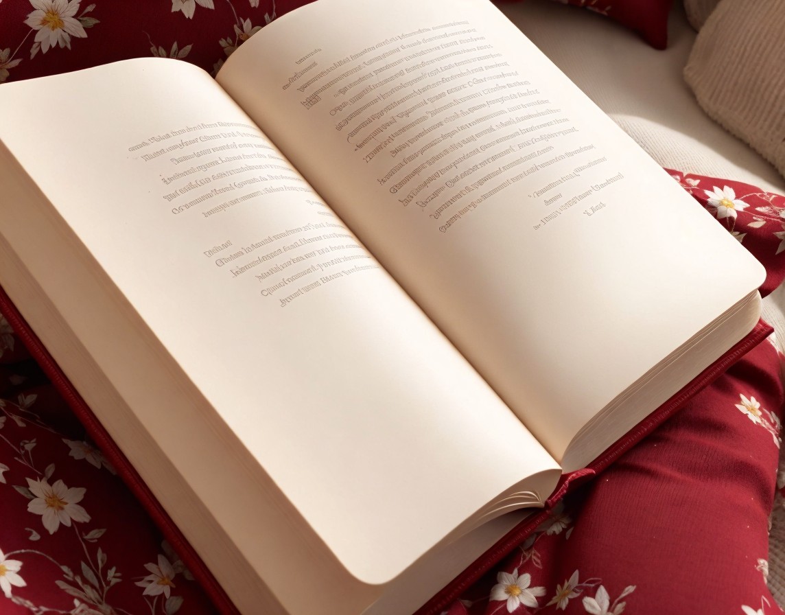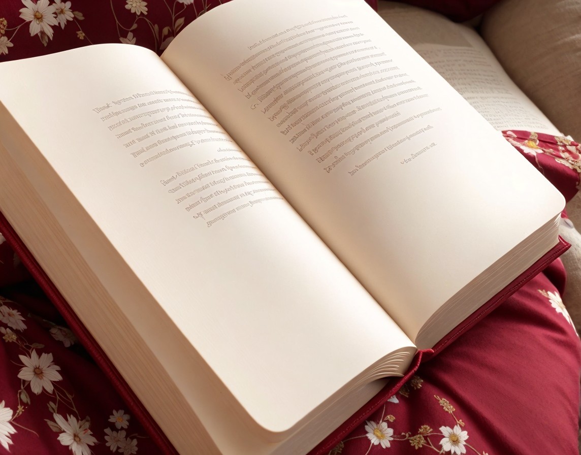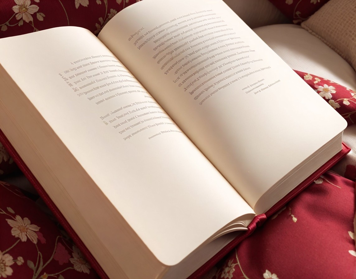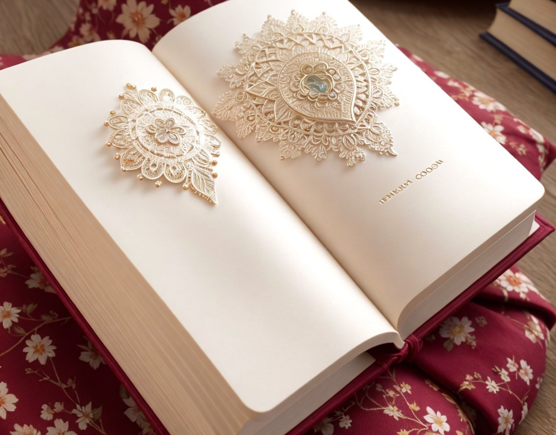 An open book with blank pages and two ornate golden heart lockets resting on top against a floral background.