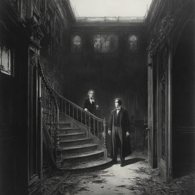 Men on grand staircase in dilapidated interior setting.