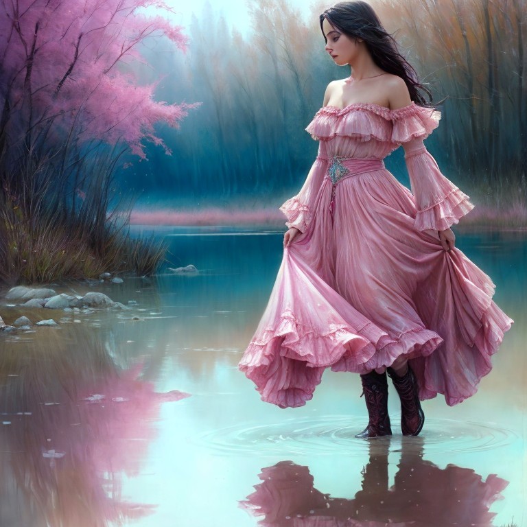 Prompt: "Pink Flamenco, wading in the shallows, water reflection, gloomy, willows, Patagonian highlands, mysterious, fantasy, intricate details, vivid fantasy, Jean Baptiste Monge, Carne Griffiths, Michael Garmash, seb mckinnon, fantasy art, polished, ethereal, ominous"